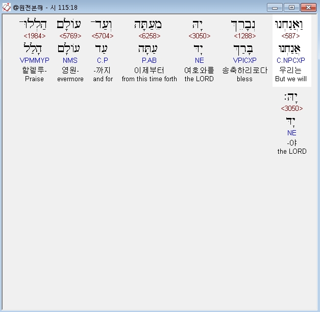 히브리어구약BHS,18 וַאֲנַחְנוּ נְבָרֵךְ יָהּ מֵעַתָּה וְעַד־עֹולָם הַלְלוּ־יָהּ׃
