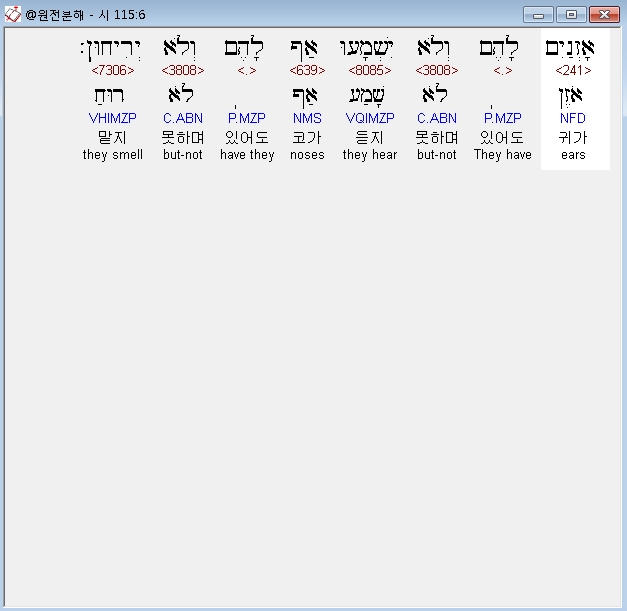 히브리어구약BHS,5 פֶּה־לָהֶם וְלֹא יְדַבֵּרוּ עֵינַיִם לָהֶם וְלֹא יִרְאוּ׃