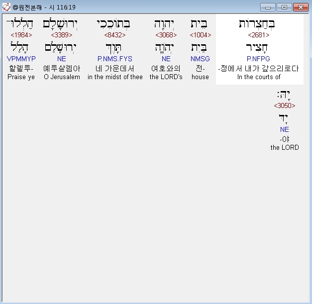 히브리어구약BHS,19 בְּחַצְרֹות בֵּית יְהוָה בְּתֹוכֵכִי יְרוּשָׁלִָם הַלְלוּ־יָהּ׃