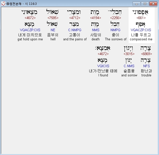 히브리어구약BHS,3 אֲפָפוּנִי חֶבְלֵי־מָוֶת וּמְצָרֵי שְׁאֹול מְצָאוּנִי צָרָה וְיָגֹון אֶמְצָא׃
