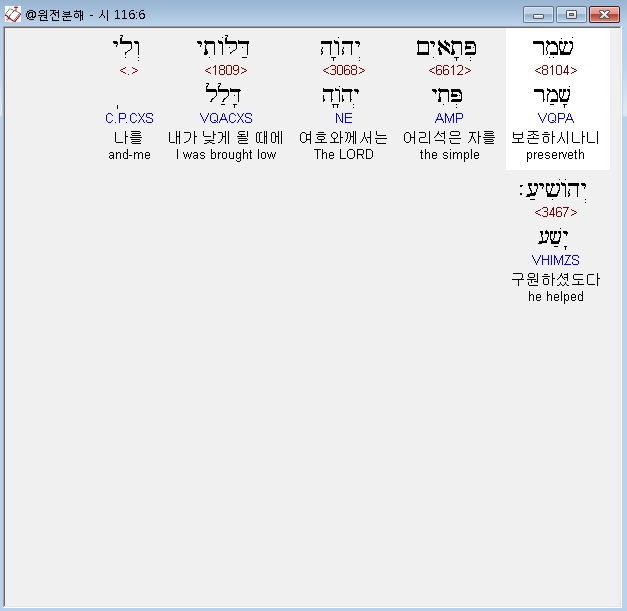 히브리어구약BHS,6 שֹׁמֵר פְּתָאיִם יְהֹוָה דַּלֹּותִי וְלִי יְהֹושִׁיעַ׃