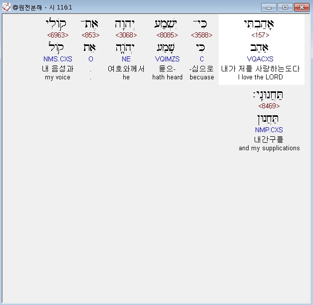 히브리어구약BHS,1 אָהַבְתִּי כִּי־יִשְׁמַע יְהוָה אֶת־קֹולִי תַּחֲנוּנָי׃