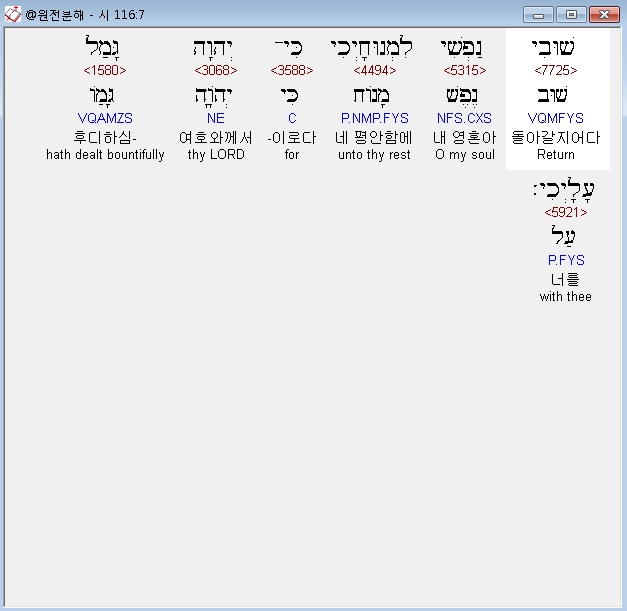 개역개정,7 내 영혼아 네 평안함으로 돌아갈지어다 여호와께서 너를 후대하심이로다