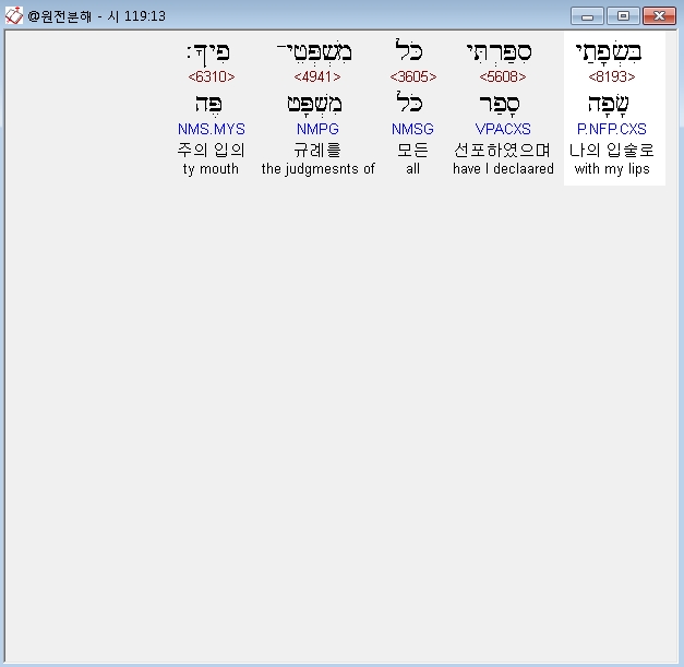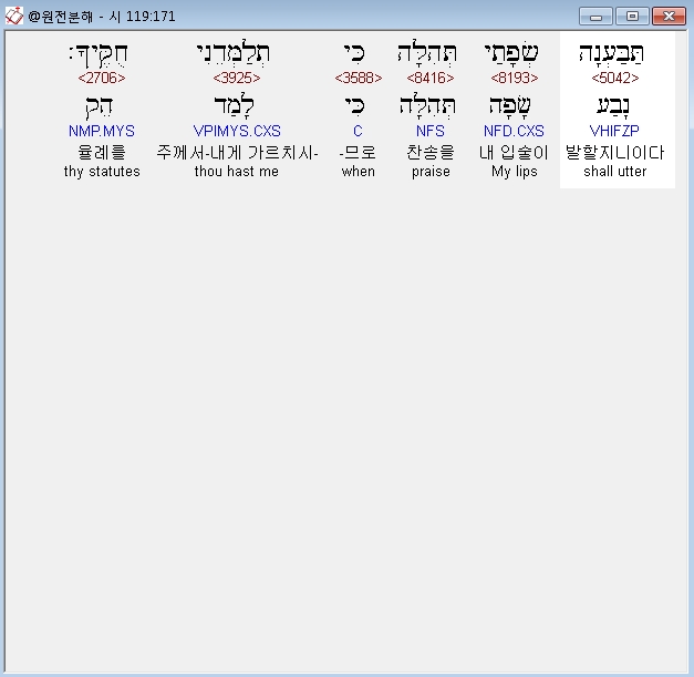 히브리어구약BHS,171 תַּבַּעְנָה שְׂפָתַי תְּהִלָּה כִּי תְלַמְּדֵנִי חֻקֶּיךָ׃
