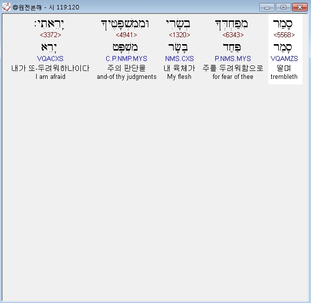 | 히브리어 시편 120편 전체 원어 원문 성경 공부 주석 강해 설교 해설 해석 (0) | 2020.10.14 |