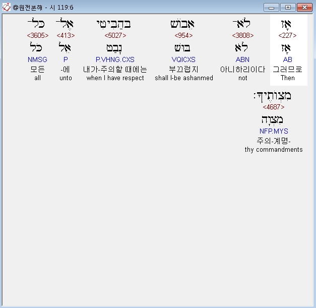 히브리어구약BHS,6 אָז לֹא־אֵבֹושׁ בְּהַבִּיטִי אֶל־כָּל־מִצְוֹתֶיךָ׃