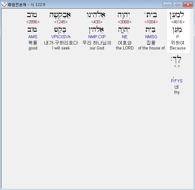 히브리어구약BHS,9 לְמַעַן בֵּית־יְהוָה אֱלֹהֵינוּ אֲבַקְשָׁה טֹוב לָךְ׃