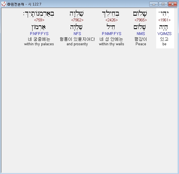 히브리어구약BHS,7 יְהִי־שָׁלֹום בְּחֵילֵךְ שַׁלְוָה בְּאַרְמְנֹותָיִךְ׃