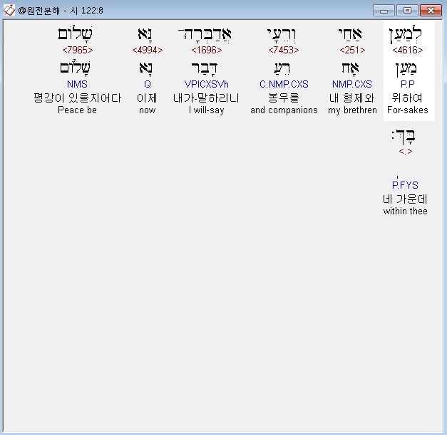 히브리어구약BHS,8 לְמַעַן אַחַי וְרֵעָי אֲדַבְּרָה־נָּא שָׁלֹום בָּךְ׃
