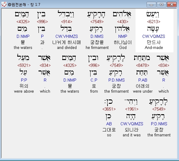 이제 창조의 대상이 무엇이었는지를 밝힌다. 히브리어 '엩'는 우리말 '~을', '~를'이고 '핫솨마임'은 복수로 '그 하늘들'이라는 뜻이다. '그리고'에 해당하는 접속사 '웨'와 '엩'가 결합하여 '웨엩'가 되었고 '하아레츠'는 '그 땅'이라는 뜻이다. 따라서 이 문장을 직역하면 '그 하늘들을 그리고 그 땅을'이다.