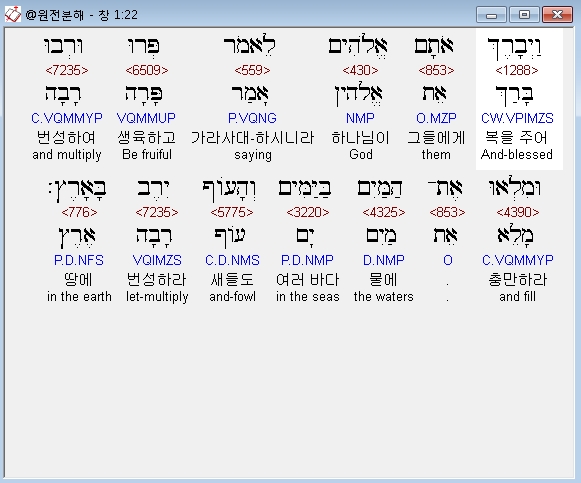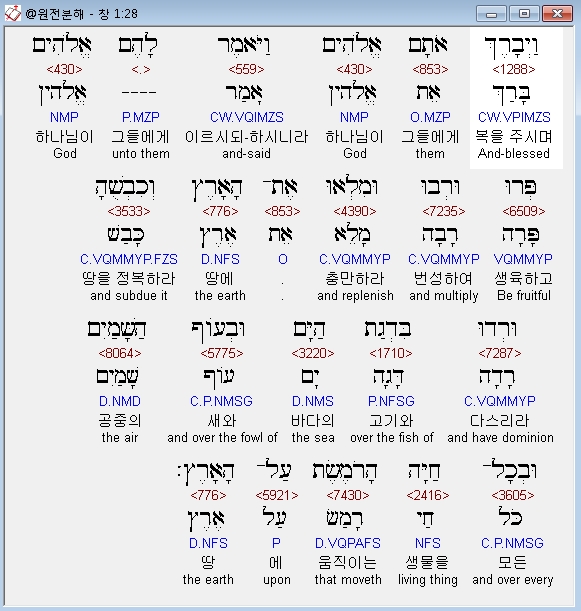 히브리어구약BHS,28 וַיְבָרֶךְ אֹתָם אֱלֹהִים וַיֹּאמֶר לָהֶם אֱלֹהִים פְּרוּ וּרְבוּ וּמִלְאוּ אֶת־הָאָרֶץ וְכִבְשֻׁהָ וּרְדוּ בִּדְגַת הַיָּם וּבְעֹוף הַשָּׁמַיִם וּבְכָל־חַיָּה הָרֹמֶשֶׂת עַל־הָאָרֶץ׃
