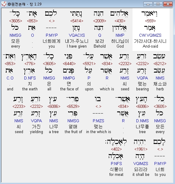 히브리어구약BHS,29 וַיֹּאמֶר אֱלֹהִים הִנֵּה נָתַתִּי לָכֶם אֶת־כָּל־עֵשֶׂב זֹרֵעַ זֶרַע אֲשֶׁר עַל־פְּנֵי כָל־הָאָרֶץ וְאֶת־כָּל־הָעֵץ אֲשֶׁר־בֹּו פְרִי־עֵץ זֹרֵעַ זָרַע לָכֶם יִהְיֶה לְאָכְלָה׃
