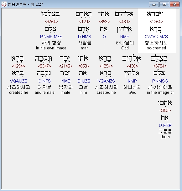 와이브라 엘로힘 엩 하아담 베찰모 베체렘 엘로힘 바라 오토 자카르 우네케바 바라 오탐