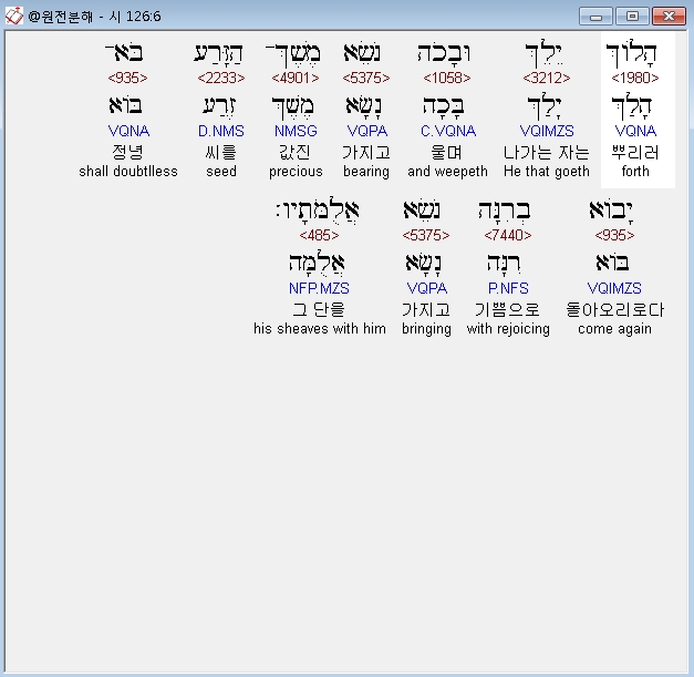 히브리어구약BHS,6 הָלֹוךְ יֵלֵךְ וּבָכֹה נֹשֵׂא מֶשֶׁךְ־הַזָּרַע בֹּא־יָבֹוא* בְרִנָּה נֹשֵׂא אֲלֻמֹּתָיו׃