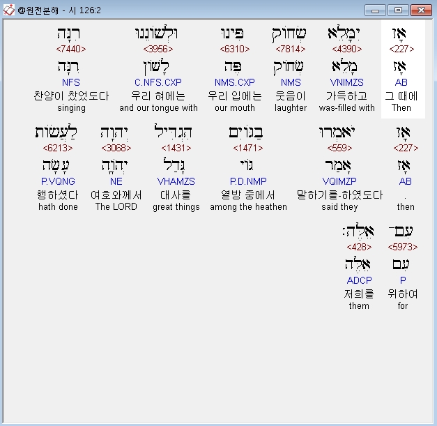 히브리어구약BHS,2 אָז יִמָּלֵא שְׂחֹוק פִּינוּ וּלְשֹׁונֵנוּ רִנָּה אָז יֹאמְרוּ בַגֹּויִם הִגְדִּיל יְהוָה לַעֲשֹׂות עִם־אֵלֶּה׃