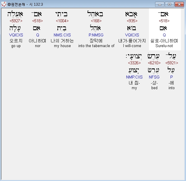 히브리어구약BHS,3 אִם־אָבֹא בְּאֹהֶל בֵּיתִי אִם־אֶעֱלֶה עַל־עֶרֶשׂ יְצוּעָי׃