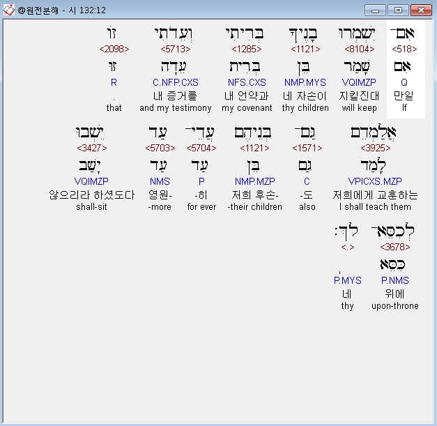 히브리어구약BHS,12 אִם־יִשְׁמְרוּ בָנֶיךָ בְּרִיתִי וְעֵדֹתִי זֹו אֲלַמְּדֵם גַּם־בְּנֵיהֶם עֲדֵי־עַד יֵשְׁבוּ לְכִסֵּא־לָךְ׃