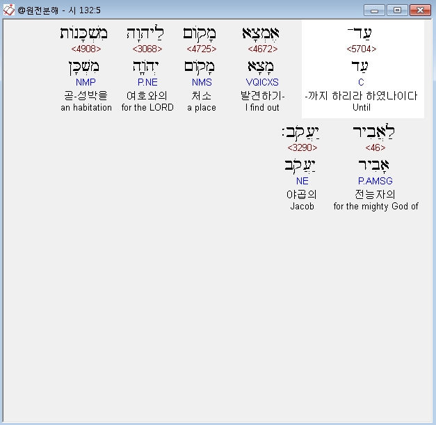 히브리어구약BHS,5 עַד־אֶמְצָא מָקֹום לַיהוָה מִשְׁכָּנֹות לַאֲבִיר יַעֲקֹב׃