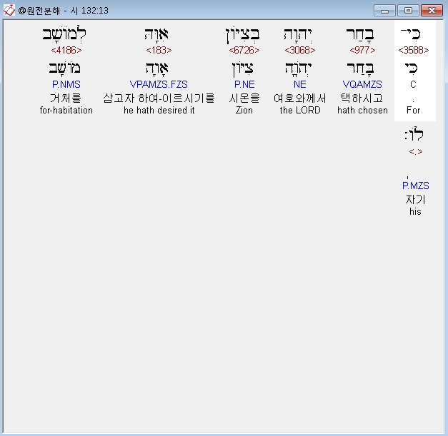 히브리어구약BHS,13 כִּי־בָחַר יְהוָה בְּצִיֹּון אִוָּהּ לְמֹושָׁב לֹו׃