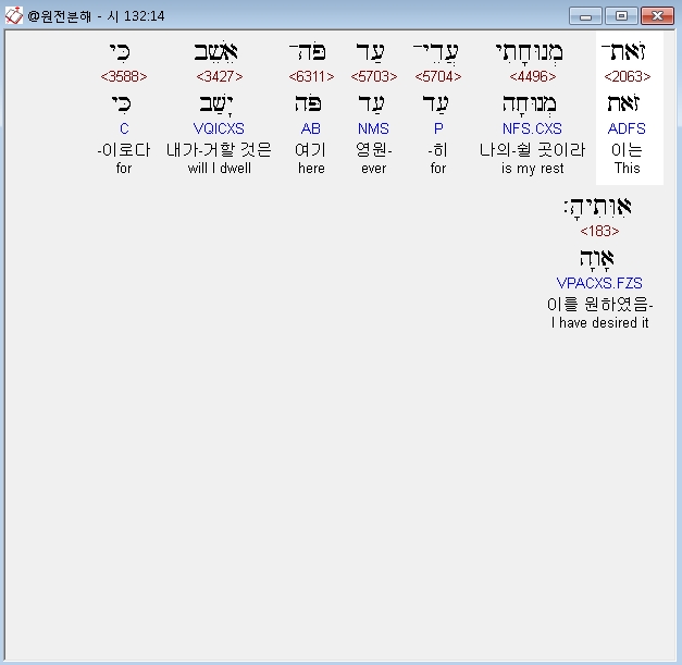 히브리어구약BHS,14 זֹאת־מְנוּחָתִי עֲדֵי־עַד פֹּה־אֵשֵׁב כִּי אִוִּתִיהָ׃