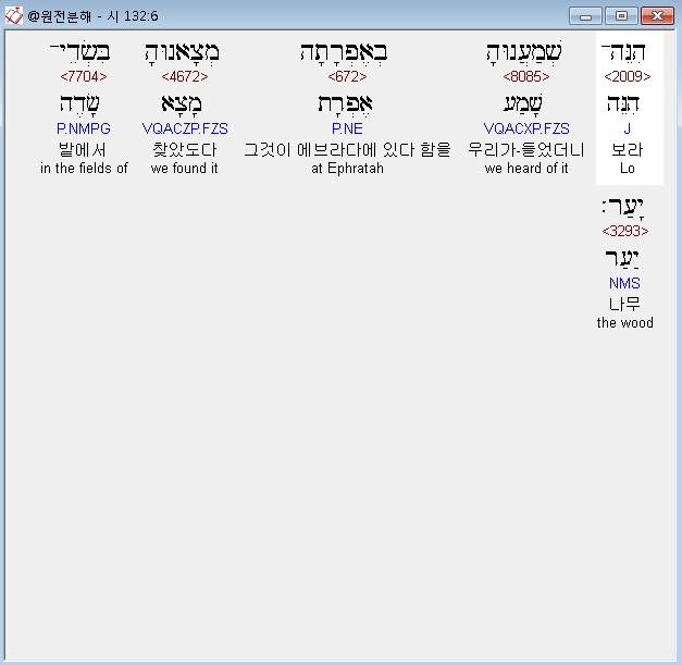 히브리어구약BHS,6 הִנֵּה־שְׁמַעֲנוּהָ בְאֶפְרָתָה מְצָאנוּהָ בִּשְׂדֵי־יָעַר׃