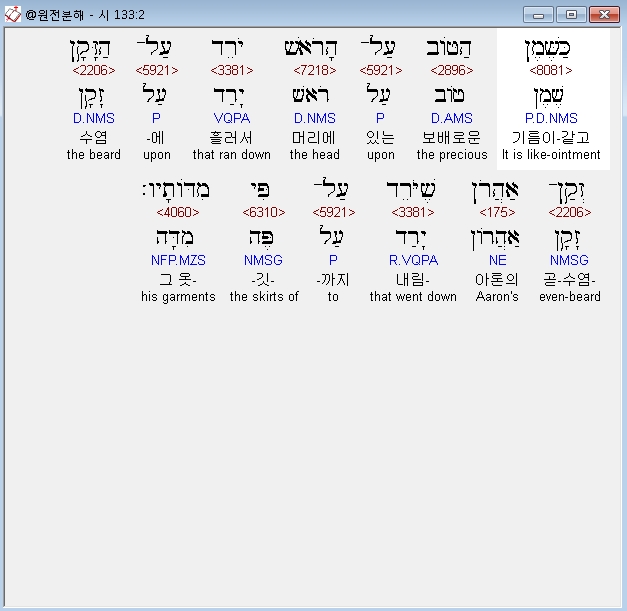 히브리어구약BHS,2 כַּשֶּׁמֶן הַטֹּוב עַל־הָרֹאשׁ יֹרֵד עַל־הַזָּקָן זְקַן־אַהֲרֹן שֶׁיֹּרֵד עַל־פִּי מִדֹּותָיו׃