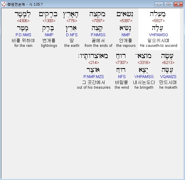 영어NASB,7 He causes the vapors to ascend from the ends of the earth; Who makes lightnings for the rain; Who brings forth the wind from His treasuries.