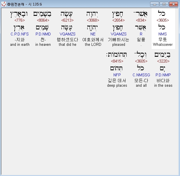 히브리어구약BHS,6 כֹּל אֲשֶׁר־חָפֵץ יְהוָה עָשָׂה בַּשָּׁמַיִם וּבָאָרֶץ בַּיַּמִּים וְכָל־תְּהֹומֹות׃