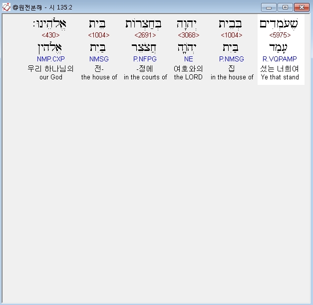 | 히브리어 시편 134편 전체 원어 원문 성경 공부 주석 강해 설교 해설 해석 (0) | 2020.10.14 |