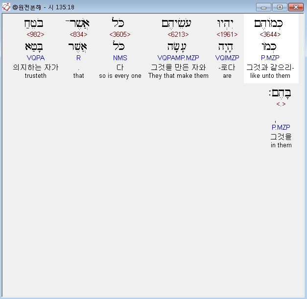 히브리어구약BHS,18 כְּמֹוהֶם יִהְיוּ עֹשֵׂיהֶם כֹּל אֲשֶׁר־בֹּטֵחַ בָּהֶם׃