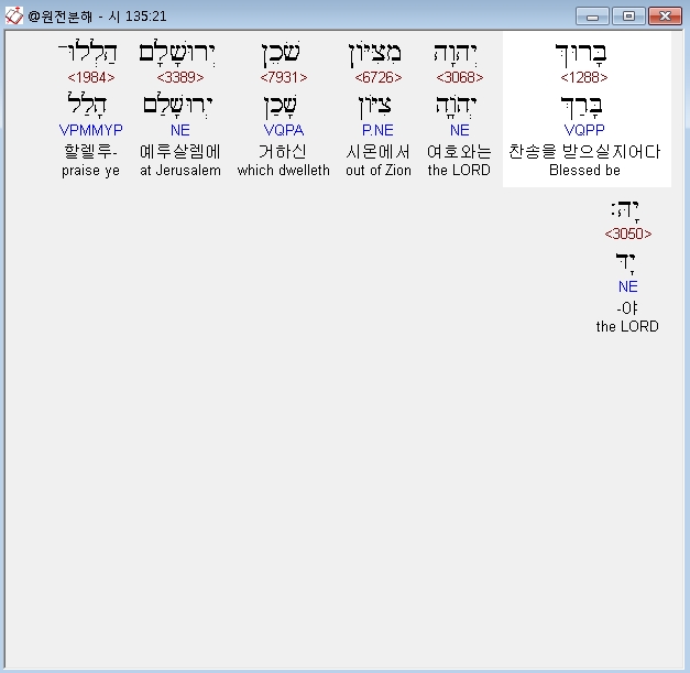 히브리어구약BHS,21 בָּרוּךְ יְהוָה מִצִּיֹּון שֹׁכֵן יְרוּשָׁלִָם הַלְלוּ־יָהּ׃