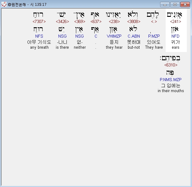 히브리어구약BHS,17 אָזְנַיִם לָהֶם וְלֹא יַאֲזִינוּ אַף אֵין־יֶשׁ־רוּחַ בְּפִיהֶם׃