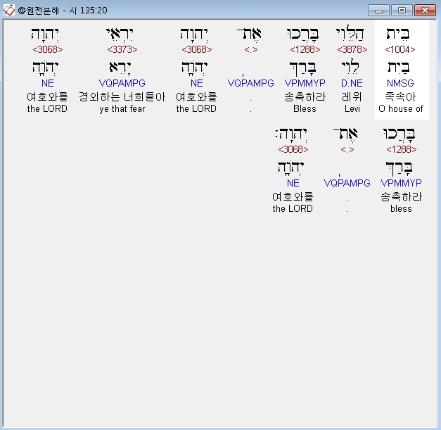 히브리어구약BHS,20 בֵּית הַלֵּוִי בָּרֲכוּ אֶת־יְהוָה יִרְאֵי יְהוָה בָּרֲכוּ אֶת־יְהוָה׃