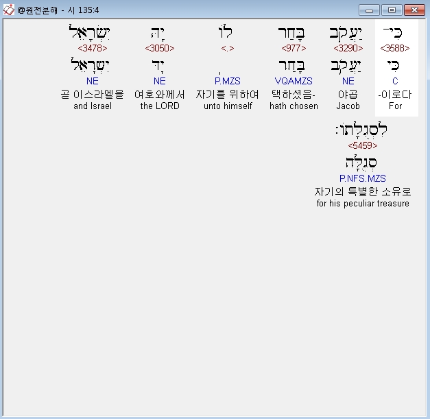 히브리어구약BHS,4 כִּי־יַעֲקֹב בָּחַר לֹו יָהּ יִשְׂרָאֵל לִסְגֻלָּתֹו׃