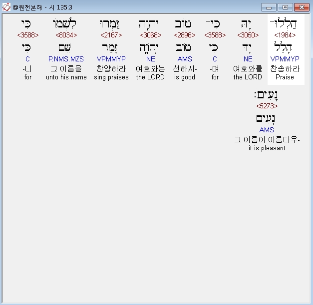 히브리어구약BHS,3 הַלְלוּ־יָהּ כִּי־טֹוב יְהוָה זַמְּרוּ לִשְׁמֹו כִּי נָעִים׃