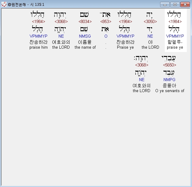 히브리어구약BHS,1 הַלְלוּ יָהּ הַלְלוּ אֶת־שֵׁם יְהוָה הַלְלוּ עַבְדֵי יְהוָה׃