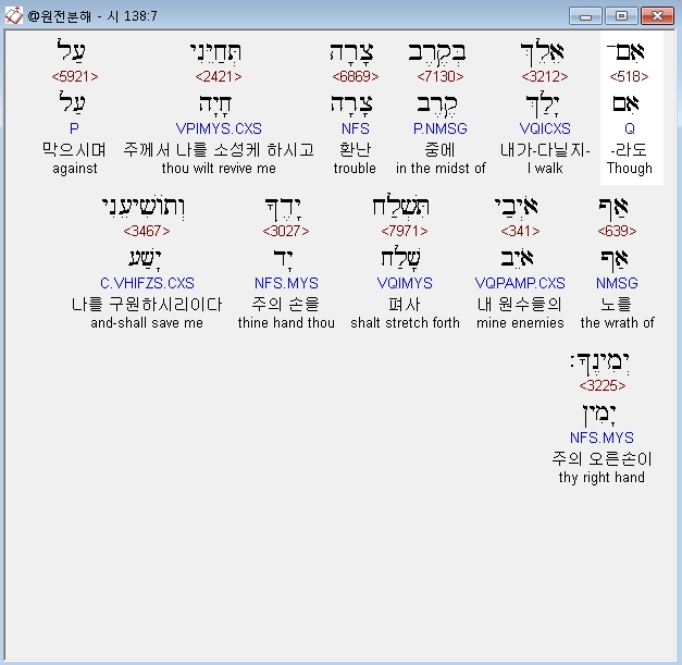 히브리어구약BHS,7 אִם־אֵלֵךְ בְּקֶרֶב צָרָה תְּחַיֵּנִי עַל אַף אֹיְבַי תִּשְׁלַח יָדֶךָ וְתֹושִׁיעֵנִי יְמִינֶךָ׃