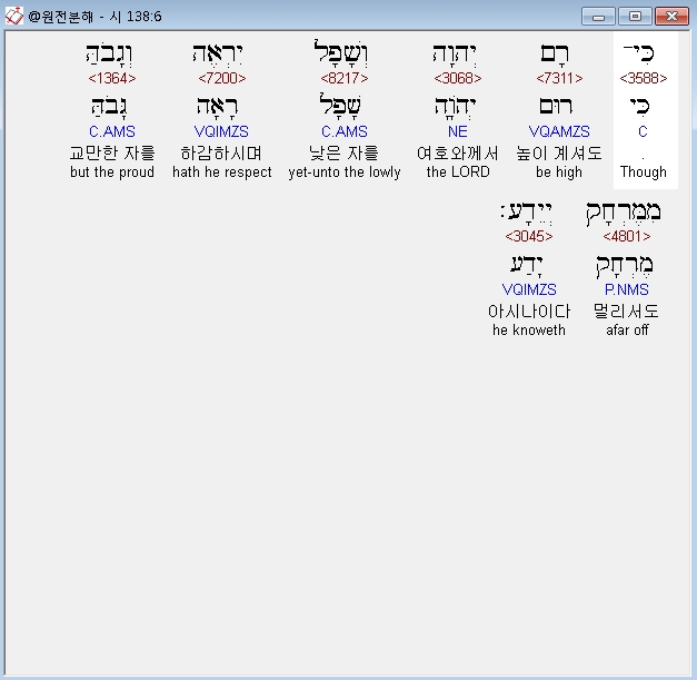 히브리어구약BHS,6 כִּי־רָם יְהוָה וְשָׁפָל יִרְאֶה וְגָבֹהַּ מִמֶּרְחָק יְיֵדָע׃