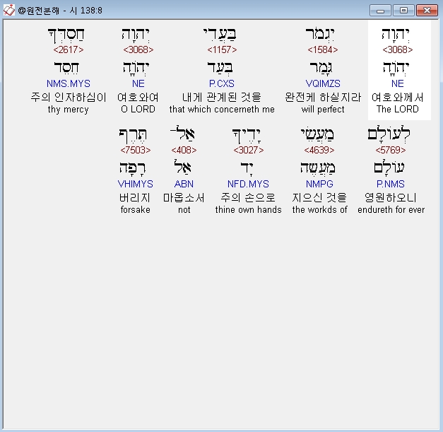 히브리어구약BHS,8 יְהוָה יִגְמֹר בַּעֲדִי יְהוָה חַסְדְּךָ לְעֹולָם מַעֲשֵׂי יָדֶיךָ אַל־תֶּרֶף׃