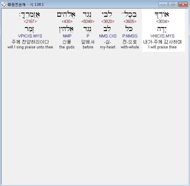 히브리어구약BHS,1 לְדָוִד אֹודְךָ בְכָל־לִבִּי נֶגֶד אֱלֹהִים אֲזַמְּרֶךָּ׃