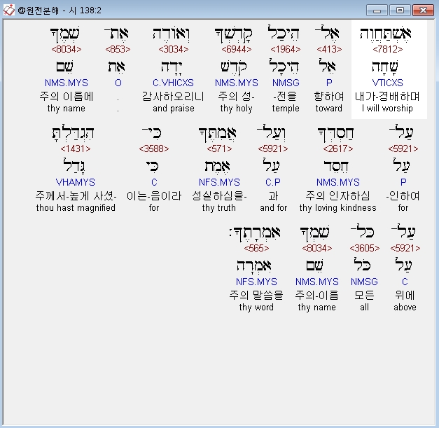 히브리어구약BHS,2 אֶשְׁתַּחֲוֶה אֶל־הֵיכַל קָדְשְׁךָ וְאֹודֶה אֶת־שְׁמֶךָ עַל־חַסְדְּךָ וְעַל־אֲמִתֶּךָ כִּי־הִגְדַּלְתָּ עַל־כָּל־שִׁמְךָ אִמְרָתֶךָ׃