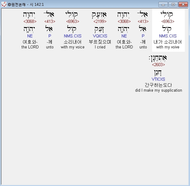 영어NASB,1 {Maskil of David, when he was in the cave. A Prayer.} I cry aloud with my voice to the LORD; I make supplication with my voice to the LORD.