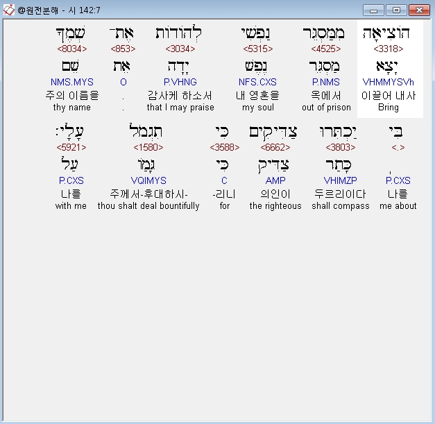 히브리어구약BHS,7 הֹוצִיאָה מִמַּסְגֵּר נַפְשִׁי לְהֹודֹות אֶת־שְׁמֶךָ בִּי יַכְתִּרוּ צַדִּיקִים כִּי תִגְמֹל עָלָי׃