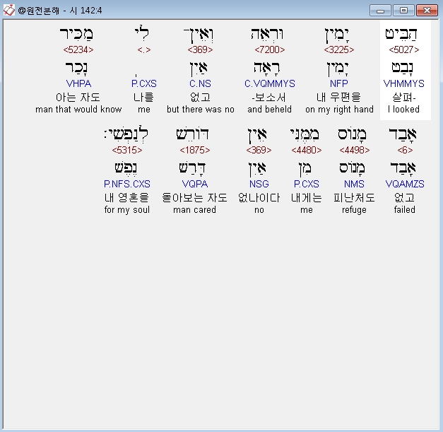 히브리어구약BHS,4 הַבֵּיט יָמִין וּרְאֵה וְאֵין־לִי מַכִּיר אָבַד מָנֹוס מִמֶּנִּי אֵין דֹּורֵשׁ לְנַפְשִׁי׃