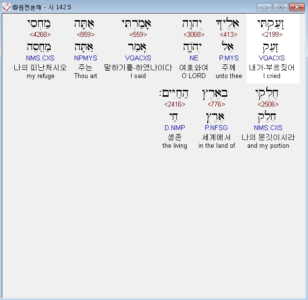 히브리어구약BHS,5 זָעַקְתִּי אֵלֶיךָ יְהוָה אָמַרְתִּי אַתָּה מַחְסִי חֶלְקִי בְּאֶרֶץ הַחַיִּים׃