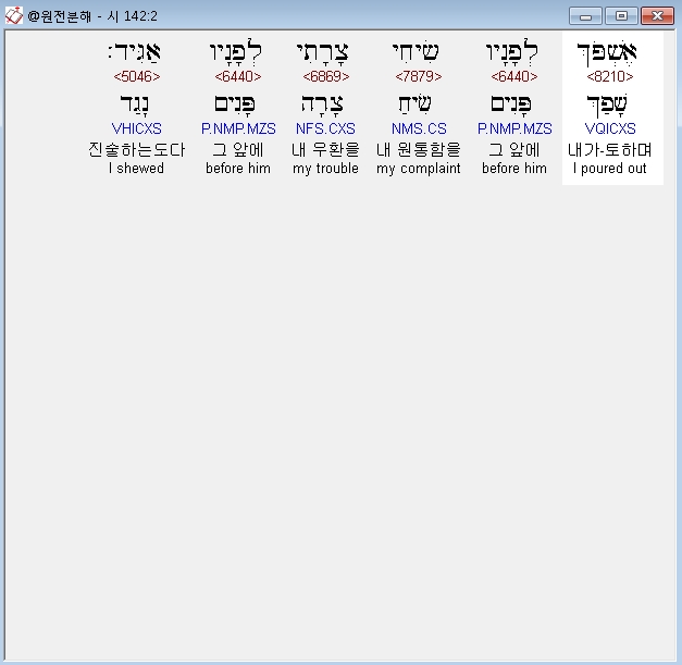 히브리어구약BHS,2 אֶשְׁפֹּךְ לְפָנָיו שִׂיחִי צָרָתִי לְפָנָיו אַגִּיד׃