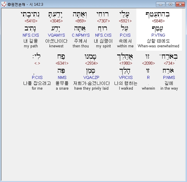 히브리어구약BHS,3 בְּהִתְעַטֵּף עָלַי רוּחִי וְאַתָּה יָדַעְתָּ נְתִיבָתִי בְּאֹרַח־זוּ אֲהַלֵּךְ טָמְנוּ פַח לִי׃