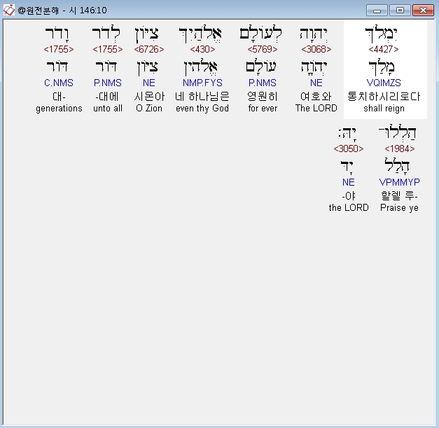 히브리어구약BHS,10 יִמְלֹךְ יְהוָה לְעֹולָם אֱלֹהַיִךְ צִיֹּון לְדֹר וָדֹר הַלְלוּ־יָהּ׃