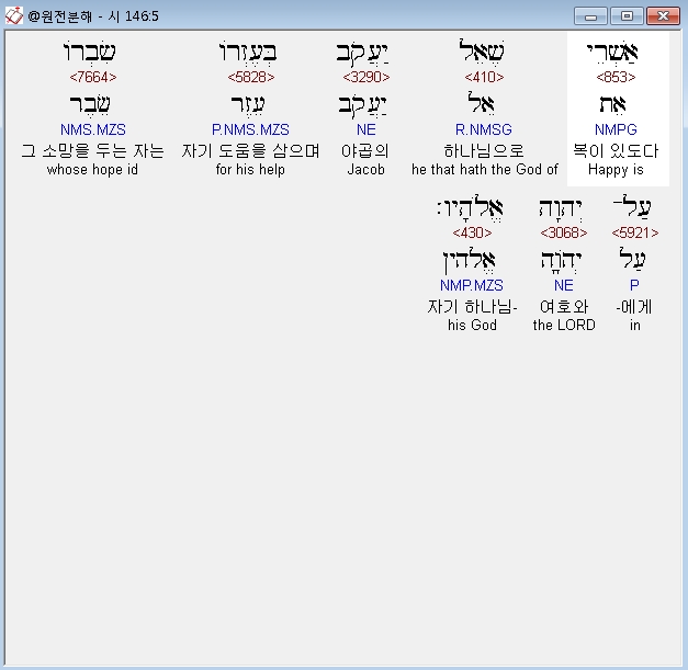 히브리어구약BHS,5 אַשְׁרֵי שֶׁאֵל יַעֲקֹב בְּעֶזְרֹו שִׂבְרֹו עַל־יְהוָה אֱלֹהָיו׃