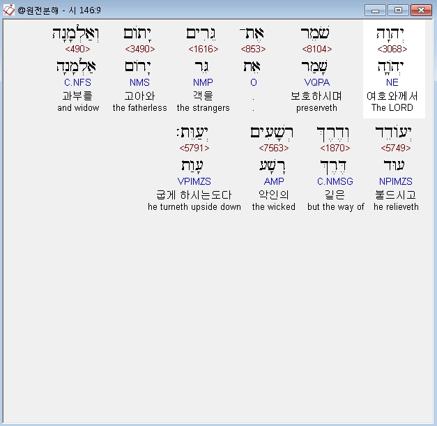 영어NASB,9 The LORD protects the strangers; He supports the fatherless and the widow; But He thwarts the way of the wicked.